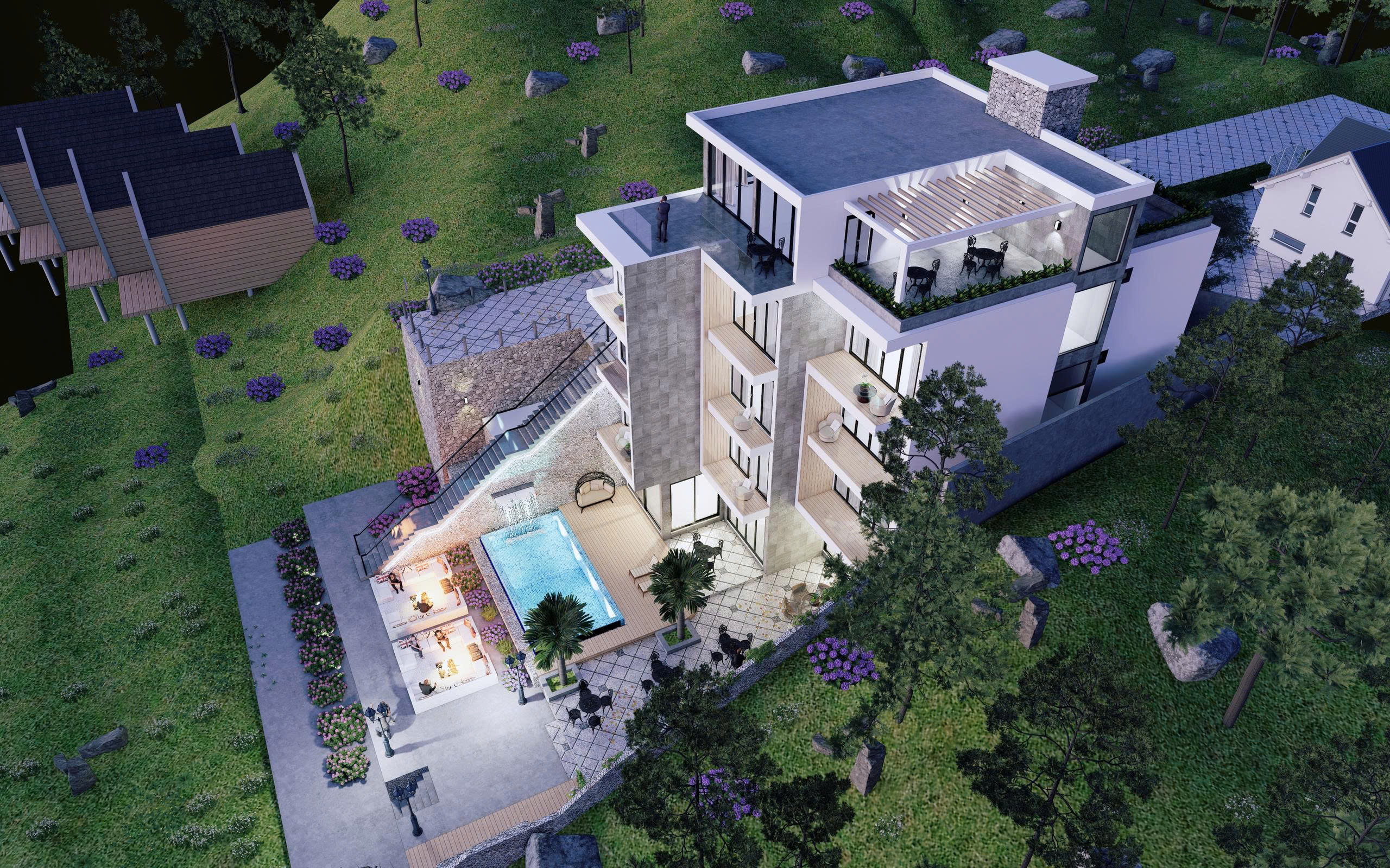 127m² phía sau là không gian hồ bơi và sân vườn, nằm trên khu vực trồng cây lâu năm, tạo nên một khu nghỉ dưỡng khép kín, tách biệt hoàn toàn với nhịp sống ồn ào bên ngoài.