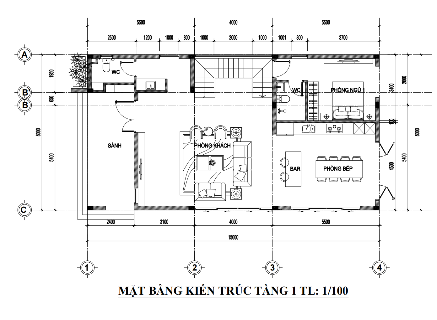Tầng 1: Phòng khách rộng rãi, kết hợp bếp ăn mở, tạo không gian sinh hoạt chung ấm cúng.
